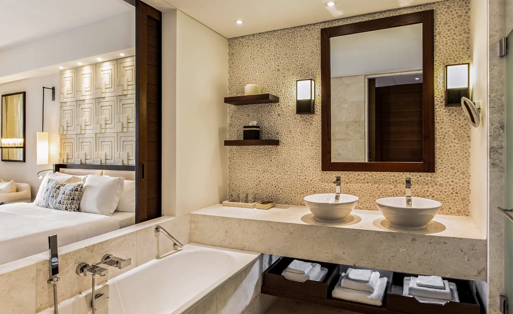 43m2. Decorated in a warm contemporary palette with cream marble and dark wood accents, these elegant rooms open onto furnished terraces or patios overlooking landscaped gardens and olive trees. A king bed, comfortable seating, and refined details create a setting of modern style and timeless grace.