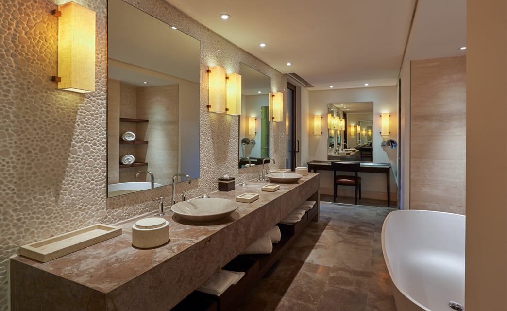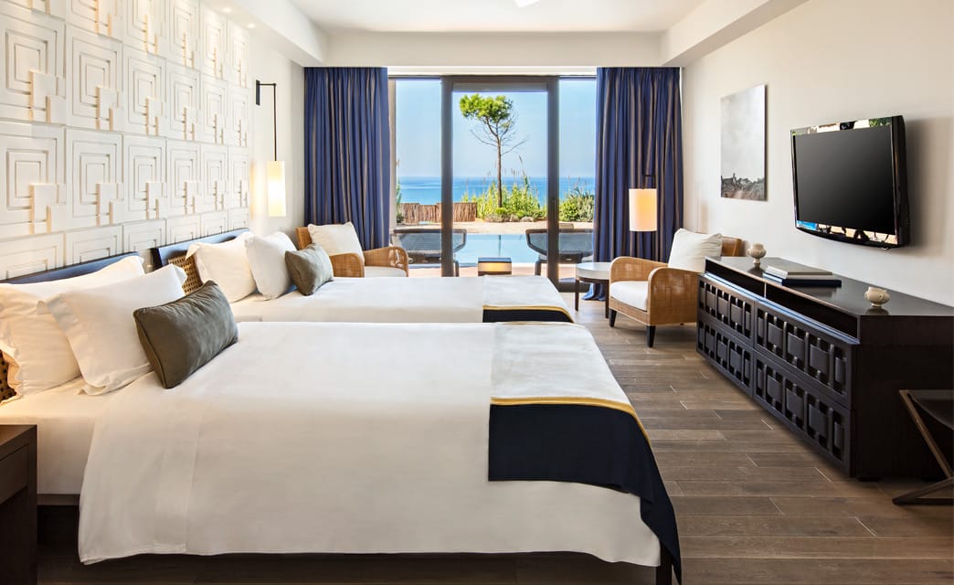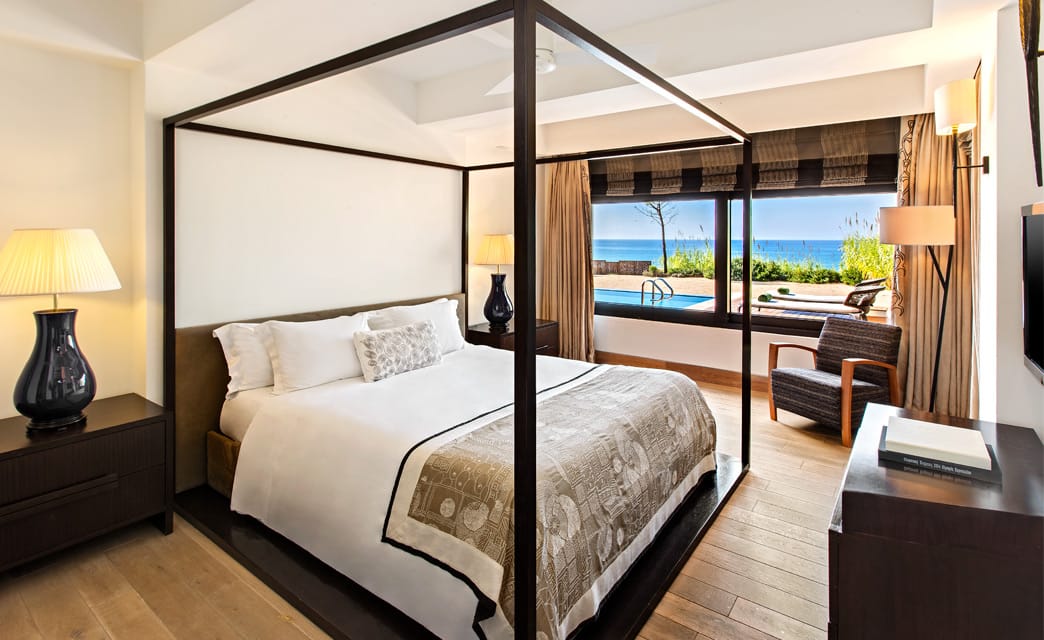 192m². Set directly on The Dunes Beach, the Ambassador Villas offer unobstructed Ionian Sea views, complete privacy, and a 73m² private infinity pool. Each features two luxurious bedrooms with marble en-suite bathrooms, an elegant lounge and dining area, and state-of-the-art home cinema, creating the perfect blend of space and sophistication.